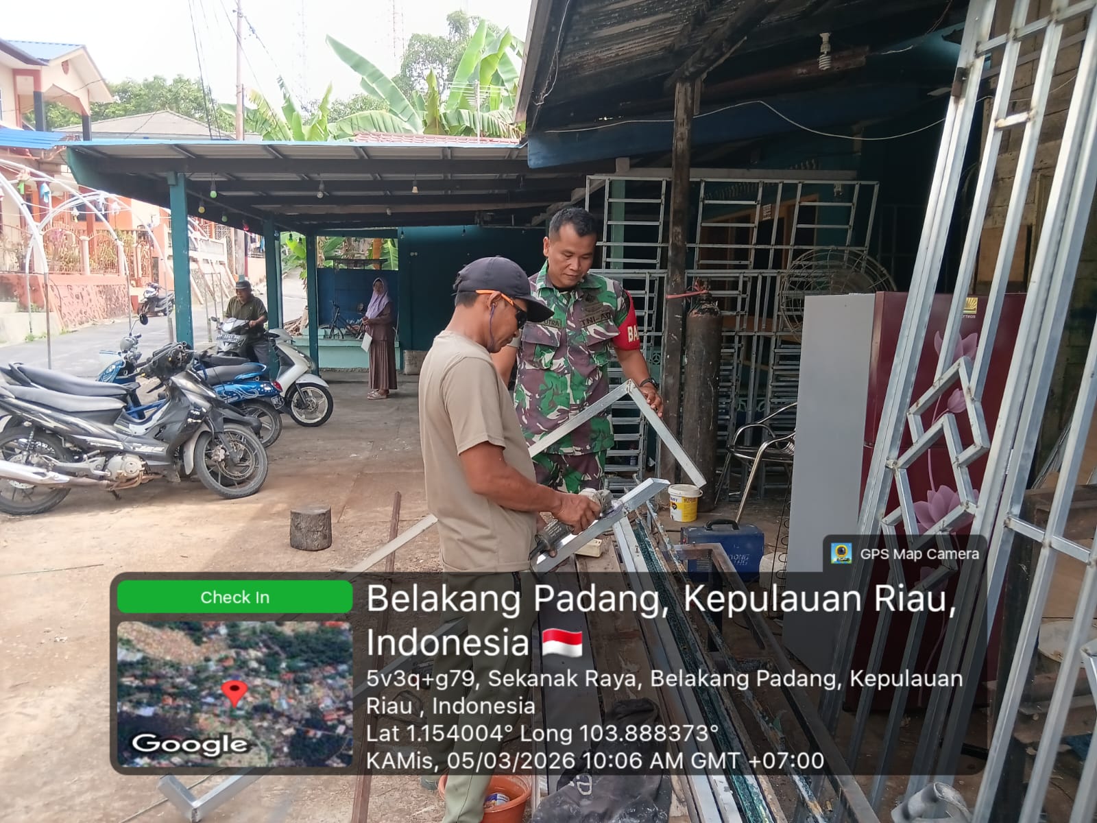 Babinsa Koramil 05/Belakang Padang itu tampak ikut membantu proses pembuatan teralis yang sedang dikerjakan warga. Menurutnya, kegiatan seperti ini merupakan bagian dari tugas Babinsa untuk selalu hadir di tengah masyarakat serta menjalin hubungan yang harmonis dengan warga binaan.