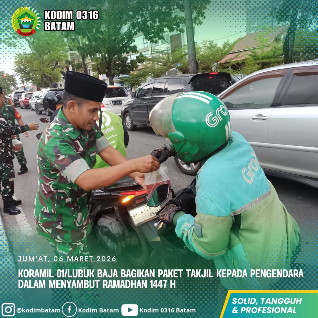 Kodim0316] Dalam rangka menyambut Bulan Suci Ramadhan 1447 Hijriah, Koramil 01/Lubuk Baja menggelar kegiatan sosial dengan membagikan ratusan paket takjil kepada masyarakat, khususnya para pengendara yang melintas di depan Markas Koramil (Makoramil) 01/LB, Kota Batam, Kepulauan Riau, Jumat (6/3/2026).