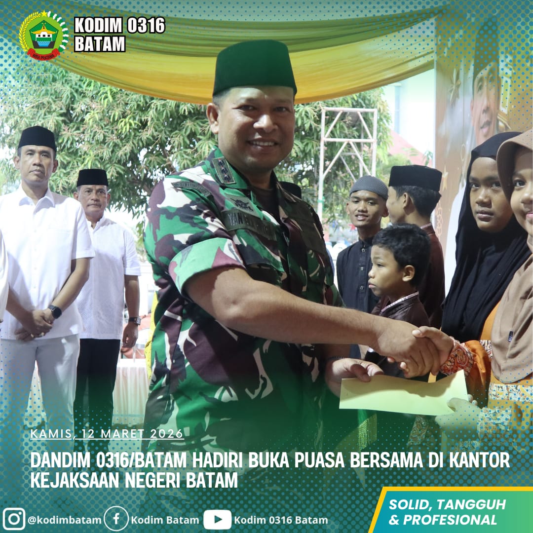 Kodim0316] Komandan Kodim (Dandim) 0316/Batam, Kolonel Arh Yan Eka Putra, S.Sos menghadiri kegiatan buka puasa bersama yang digelar di Kantor Kejaksaan Negeri Batam, Jumat (Ramadan 2026). Kegiatan yang berlangsung dalam suasana penuh kehangatan ini turut menghadirkan anak-anak yatim piatu serta penyandang disabilitas sebagai tamu kehormatan.