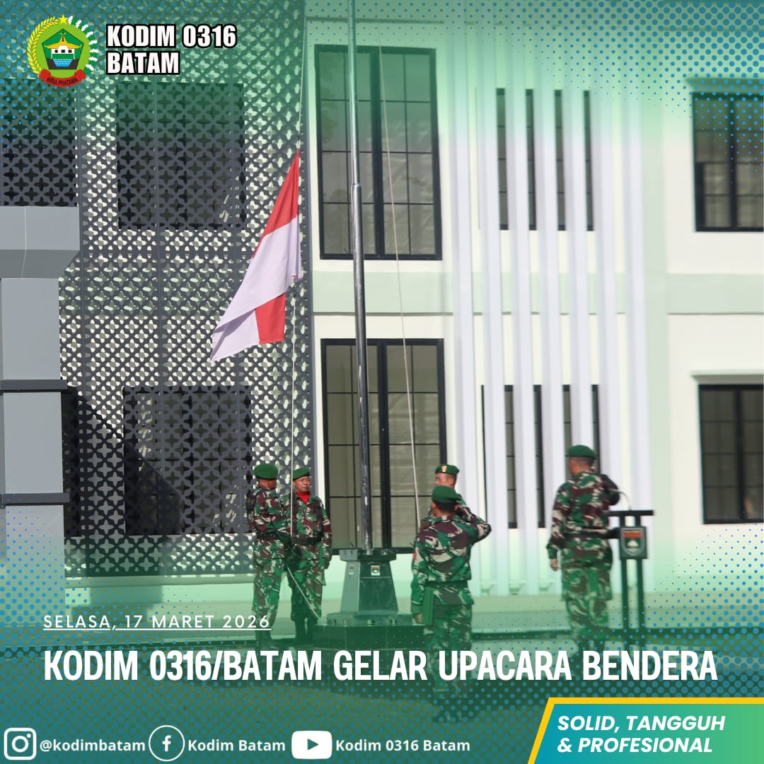 Kodim0316] Komando Distrik Militer (Kodim) 0316/Batam menggelar upacara bendera rutin tanggal 17 setiap bulan yang berlangsung khidmat di lapangan Markas Kodim 0316/Batam, Selasa (17/3/2026). Kegiatan tersebut menjadi bagian dari upaya pembinaan mental dan ideologi prajurit dalam memperkuat semangat kebangsaan serta loyalitas kepada Negara Kesatuan Republik Indonesia (NKRI).