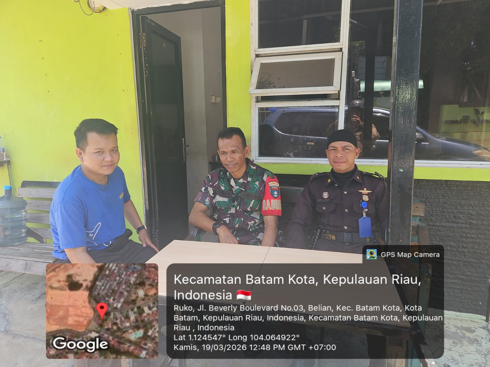Kodim0316]  Dalam upaya memperkuat keamanan lingkungan sekaligus menjalin hubungan yang harmonis dengan masyarakat, Bintara Pembina Desa (Babinsa) Kelurahan Belian, Koramil 03/Nongsa, melaksanakan kegiatan komunikasi sosial (komsos) bersama petugas keamanan di wilayah binaannya, Kamis (19/3/2026).