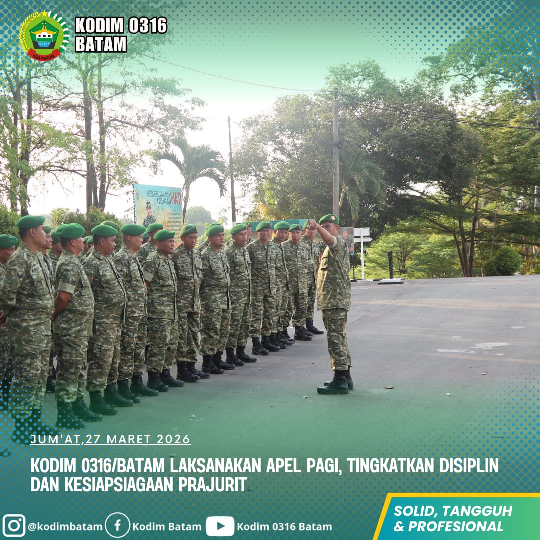 Kodim0316] Komando Distrik Militer (Kodim) 0316/Batam melaksanakan apel pagi rutin sebagai bagian dari upaya membangun kedisiplinan serta meningkatkan kesiapsiagaan prajurit dalam menjalankan tugas kewilayahan. Kegiatan tersebut berlangsung di Lapangan Makodim 0316/Batam, Jumat (27/3/2026), dan diikuti seluruh personel militer dengan tertib dan penuh semangat.