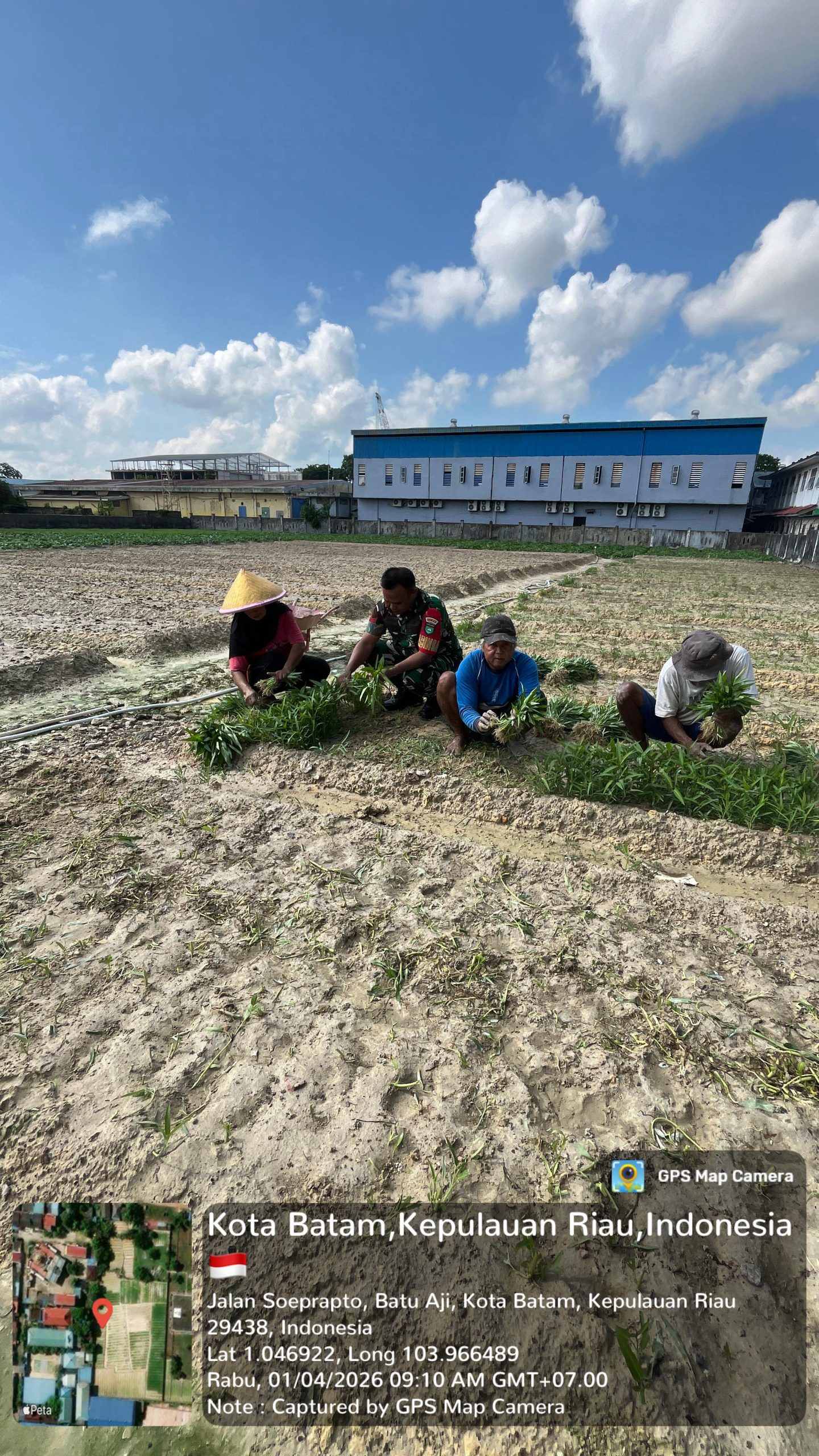 Kegiatan tersebut dilaksanakan pada Rabu (1/4/2026) sekitar pukul 09.00 WIB, bertempat di area Taman Makam Pahlawan, Perumahan Puskopkar Blok A RT 02/RW 01, Kelurahan Bukit Tempayan, Kecamatan Batu Aji, Kota Batam. Dalam kegiatan itu, Babinsa Koptu Ahmadi turut serta membantu warga memanen sayuran yang ditanam di sekitar lokasi.