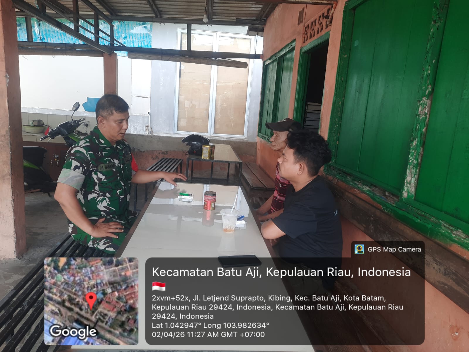 Kodim0316] – Babinsa Kelurahan Kibing, Koramil 02/Sekupang, Kodim 0316/Batam, Sertu Marzen Tanjung melaksanakan kegiatan komunikasi sosial (komsos) bersama warga binaan di RW 09 Perumahan MKGR, Kelurahan Kibing, Kecamatan Batu Aji, Kamis (2/4/2026).