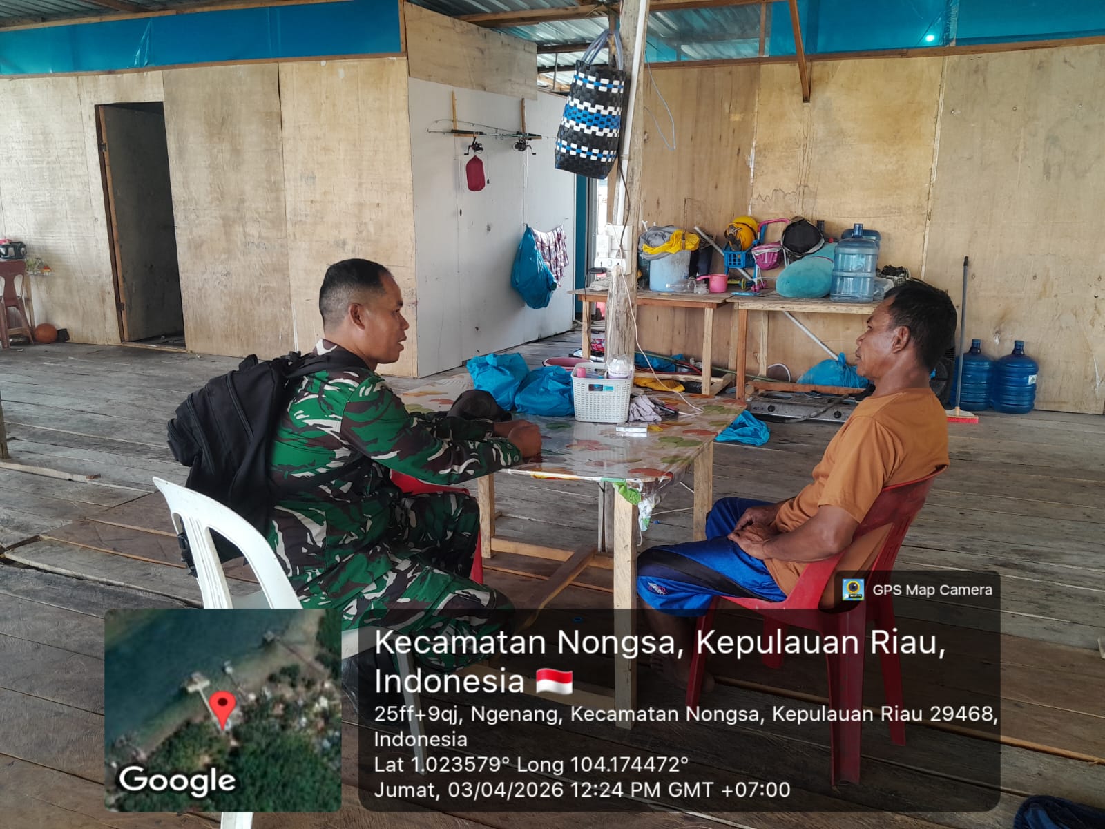 Kodim0316] Upaya menjaga stabilitas keamanan dan mempererat hubungan sosial di tengah masyarakat terus dilakukan jajaran TNI melalui kegiatan komunikasi sosial (komsos). Seperti yang dilakukan Babinsa Koramil 03/Nongsa di wilayah Pulau Ngenang, Kecamatan Nongsa, Kota Batam, Jumat (3/4/2026).
