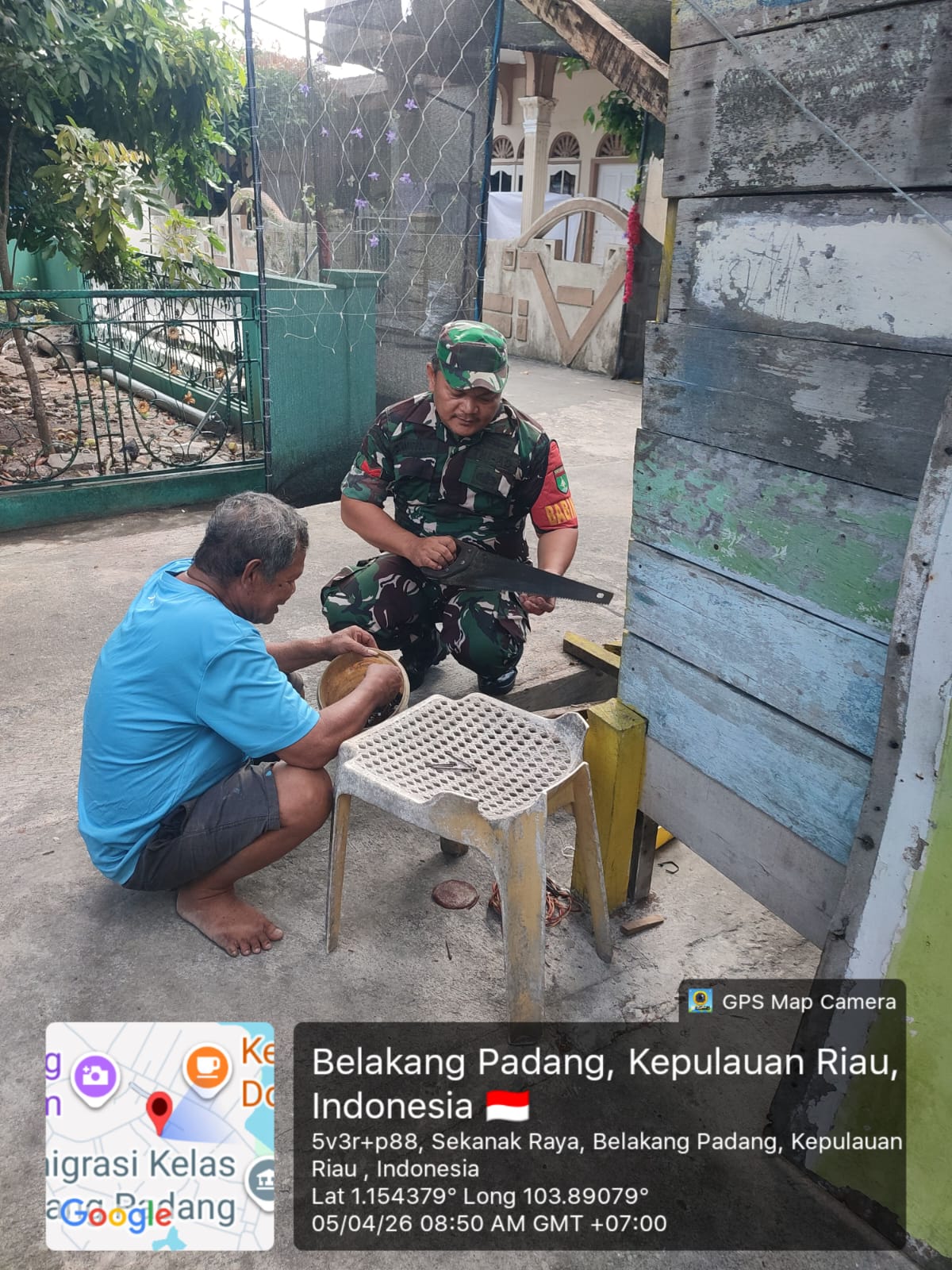 Kodim0316] Dalam upaya mempererat hubungan dengan masyarakat sekaligus meningkatkan kepedulian terhadap lingkungan dan kesejahteraan warga, Babinsa Koramil 05 Belakang Padang melaksanakan kegiatan komunikasi sosial (komsos) bersama warga binaan di wilayah Kelurahan Pulau Terong, Kecamatan Belakang Padang, Minggu (5/4/2026).