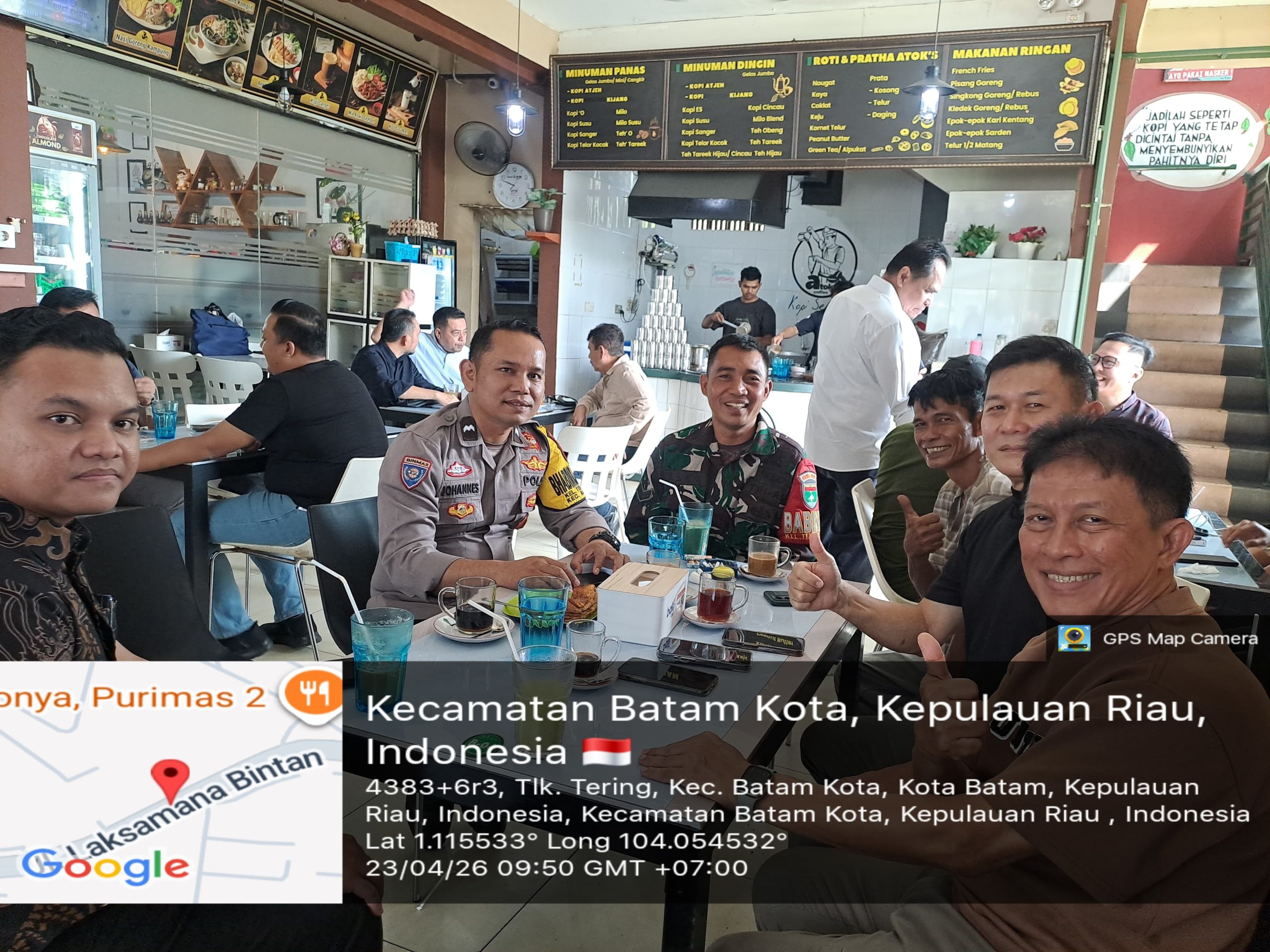 Kodim0316] Dalam rangka menjaga ketertiban wilayah serta merespons aspirasi masyarakat, Babinsa Kelurahan Teluk Tering, Koramil 03/Nongsa, Sertu Alex melaksanakan kegiatan Komunikasi Sosial (Komsos) bersama unsur pemerintah dan tokoh masyarakat di Kedai Kopi Atok, kawasan Batam Centre, Kecamatan Batam Kota, Kamis (23/4/2026).