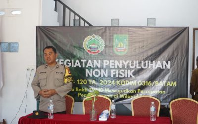 bhabinkamtibmas Aipda agus Sugiono Saat menyampaikan pemaparannya. Kodim/0316[Ter]- TNI melalui Program TNI Manunggal Membangun Desa (TMMD) Reguler Ke-120 Kodim 0316/Batam memberikan penyuluhan hukum dan Bela Negara kepada warga Kavling Bukit Pelita Indah Bertempat di Posko TMMD 120 Kelurahan Kabil , Kecamatan Nongsa Kota Batam, Selasa (13/05/2024). Dalam sambutannya Lettu Inf Sahrudi(Pasiter Kodim0316/Batam) menyampaikan bahwa kegiatan…